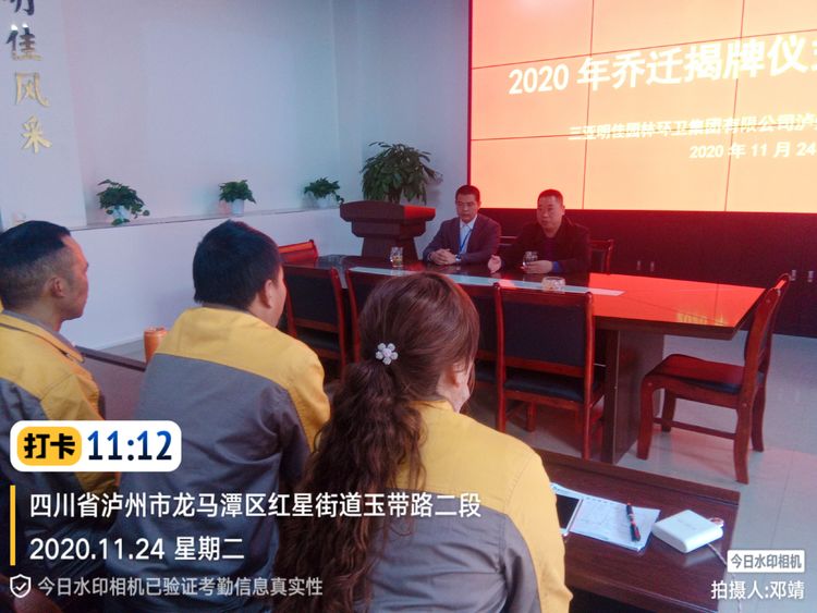 2020年11月24日,明佳集團(tuán)瀘州分公司新辦公室喬遷儀式隆重舉行。人大主任詹萬(wàn)勇,區(qū)綜合行政執(zhí)法局環(huán)衛(wèi)股股長(zhǎng)趙耿、重慶中仁公司昌總等領(lǐng)導(dǎo)來到明佳集團(tuán)瀘州分公司新辦公場(chǎng)地,為煥然一新的辦公樓正式啟用進(jìn)行喬遷揭牌。集團(tuán)公司生產(chǎn)質(zhì)安部副經(jīng)理鞠彬、集團(tuán)公司生產(chǎn)質(zhì)安部副經(jīng)理段永強(qiáng)、綜合辦公室、財(cái)務(wù)部、各部門管理人員共同見證這一歡慶時(shí)刻。