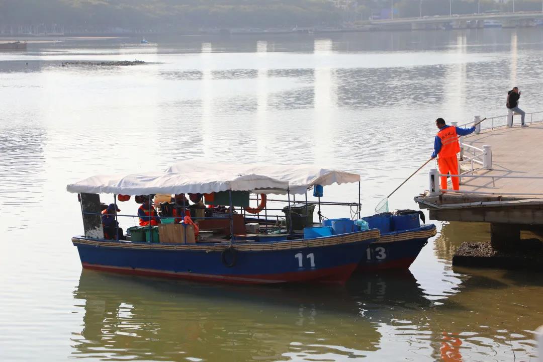 每天工作都是從早上7點鐘到下午的6點半,我們是分段來的。主要是坐船去收集河上的一些垃圾,一天巡邏清掃一次,清掃完了回來再巡邏保潔。水面和紅樹林里的垃圾都要清理。下雨天我們也要出來(工作),臺風天就要做好防風的工作,如果是下雨,我們一樣要出來打撈垃圾。