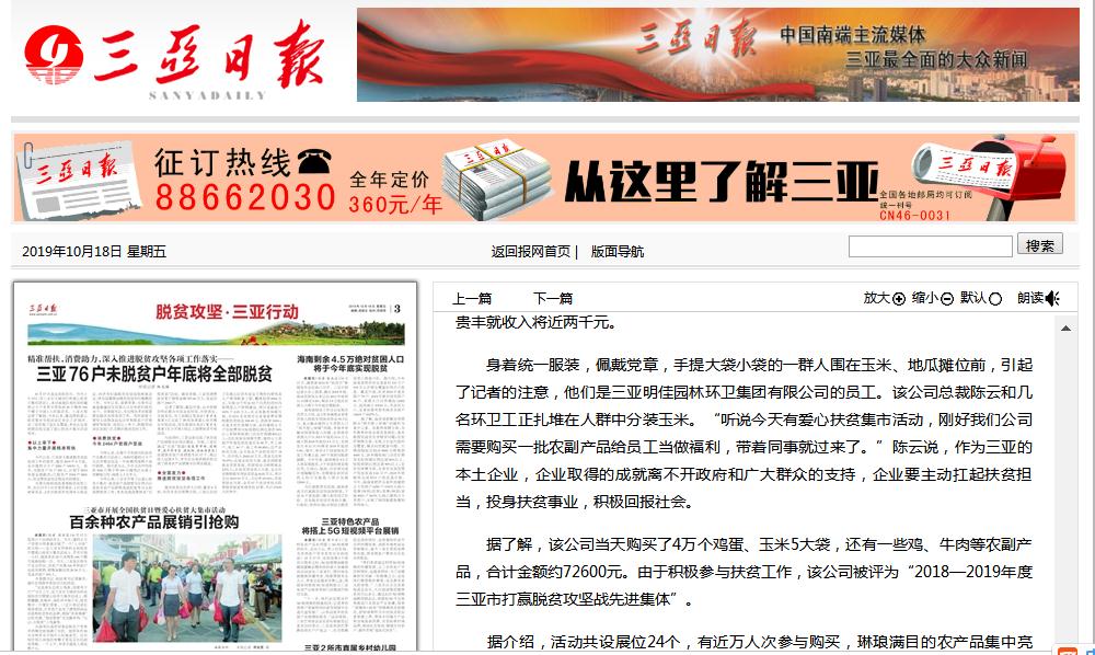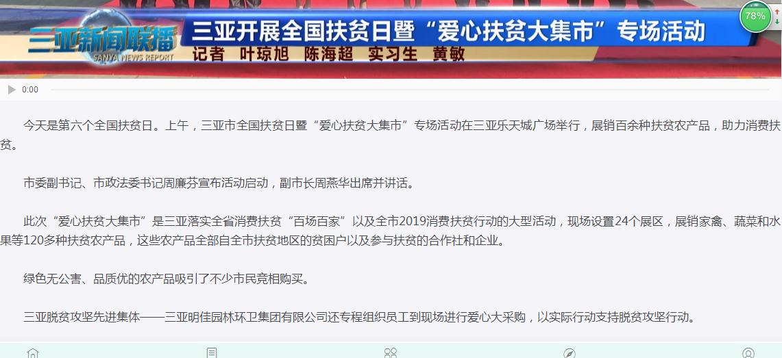 明佳集團(tuán)作為三亞的本土企業(yè),主動扛起扶貧擔(dān)當(dāng),投身扶貧事業(yè),積極回報(bào)社會。在此次大采購活動中,集團(tuán)員工在總裁陳云的帶領(lǐng)下,購買了4萬個(gè)雞蛋、玉米5大袋,還有一些雞、牛肉等農(nóng)副產(chǎn)品,合計(jì)金額約72600元。三亞日報(bào)和三亞新聞聯(lián)播分別對明佳集團(tuán)的愛心大采購活動進(jìn)行了報(bào)道。